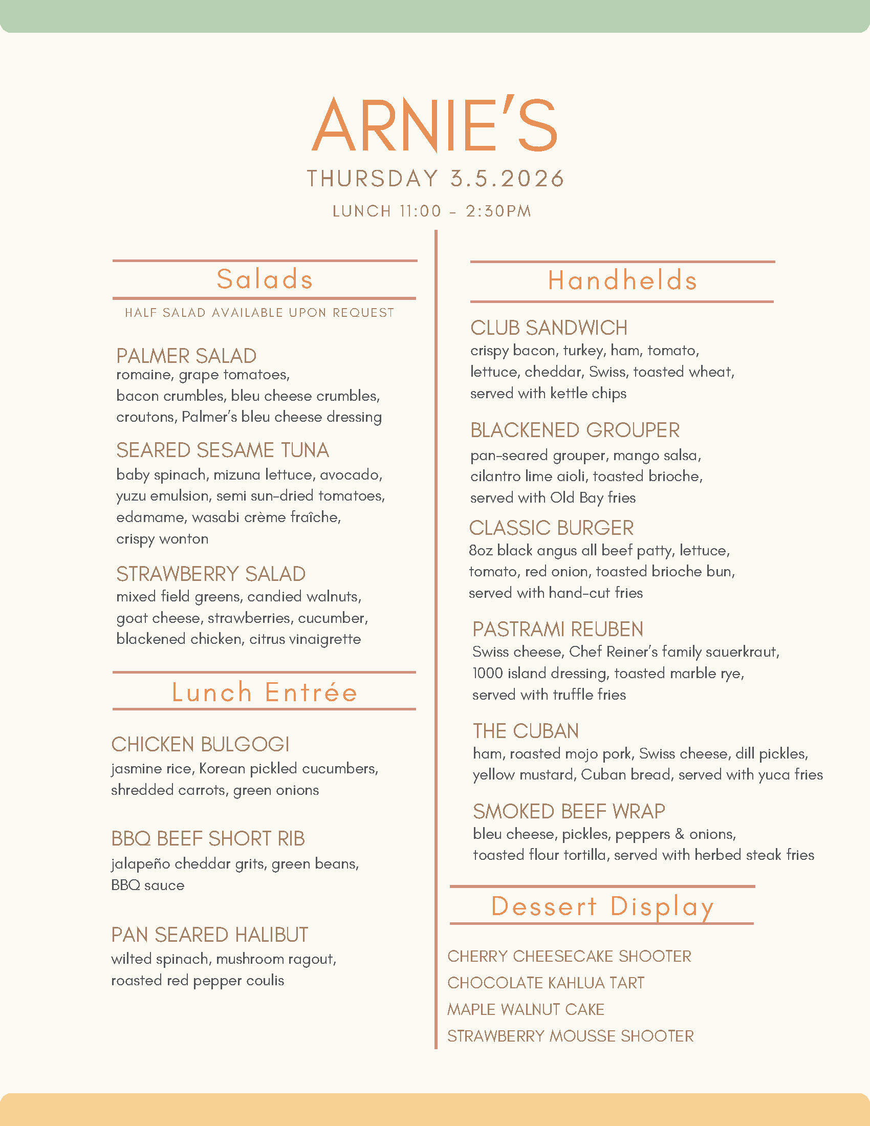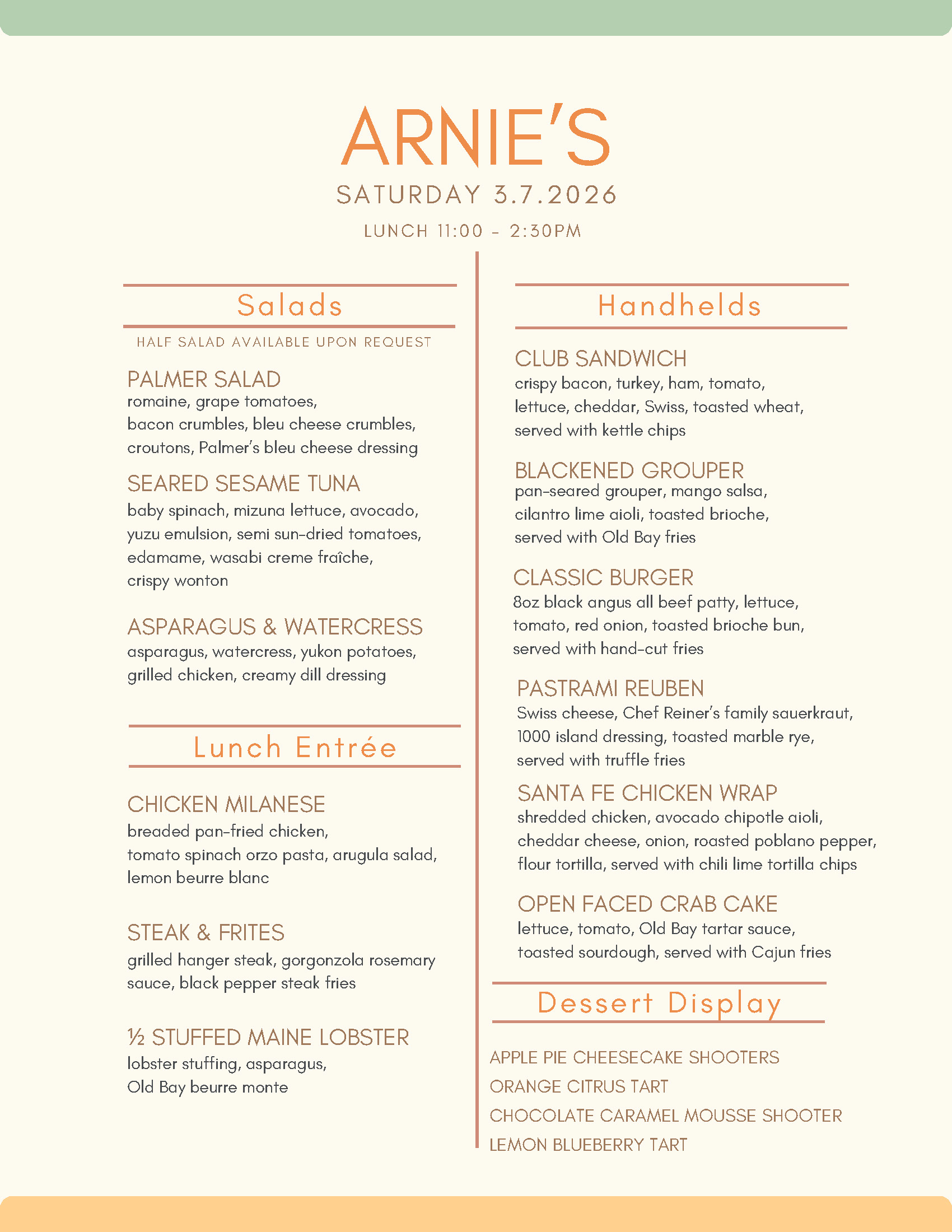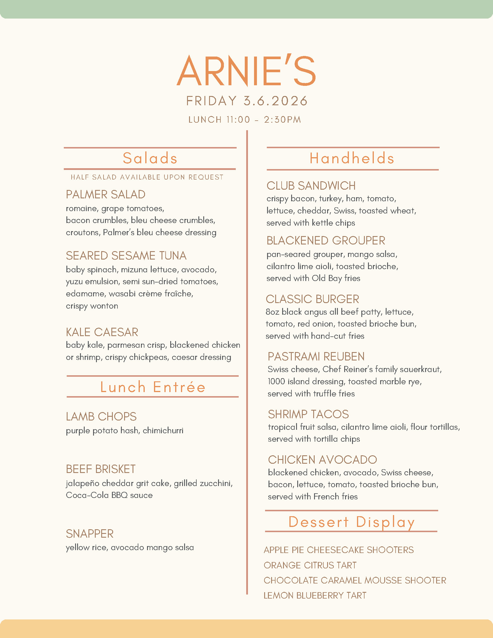 Located inside the Bay Hill Clubhouse, Arnie’s offers reserved table seating and food service daily during lunch hours in a private intimate setting.